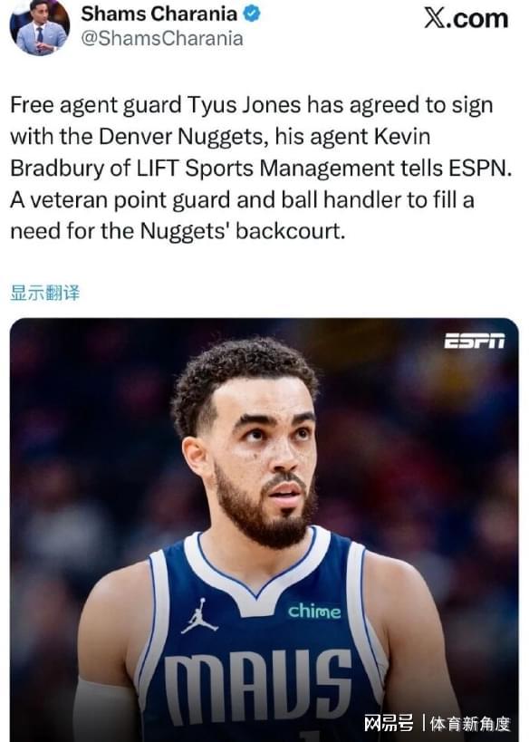 知名爆料人Shams透露,泰厄斯 - 琼斯已正式确定加盟掘金。随后,掘金队随队记者Durando进一步披露,琼斯与掘金签下的是一份底薪合约期限直至本赛季结束。