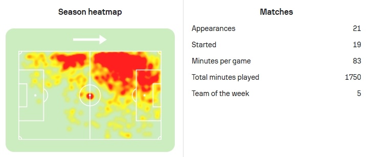 如果现在再回看迪亚斯的参与进球和参与制造得分机会完整点位图,你会发现,迪亚斯最有威胁的时间主要集中在下半场前半段和后半段,这两个足球比赛尤为关键的时期。本赛季,拜仁在落后或胶着的比赛中,迪亚斯贡献7球4助,独造11球,占球队胶着局进球数的42%。迪亚斯的所有数据,都是在全德甲所有球员压力值最大的情况下取得的,即便这样他竟然只是本赛季德甲场均评分第二的左边锋,但所有数据都能证明迪亚斯有一颗大心脏。